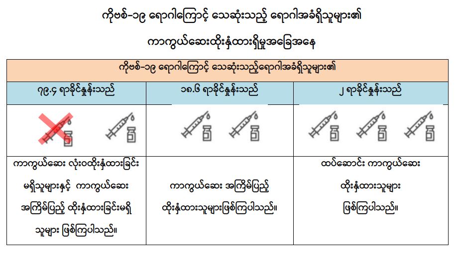 သို့ဖြစ်ပါ၍ မြန်မာနိုင်ငံတွင် ကိုဗစ်-၁၉ ရောဂါကြောင့် သေဆုံးသူများအတွင်း နာတာရှည်ရောဂါ ရောဂါအခံရှိသူများ၏ ကာကွယ်ဆေးထိုးနှံမှုအခြေအနေကို လေ့လာသုံးသပ်ချက်အရ အဆိုပါပုဂ္ဂိုလ်များအနက် ကာကွယ်ဆေးအကြိမ်ပြည့် ထိုးနှံထားသူများနှင့် ထပ်ဆောင်း ကာကွယ်ဆေး ထိုးနှံထားသူများတွင် ကိုဗစ်-၁၉ ရောဂါကြောင့် သေဆုံးမှုကို သိသာစွာလျှော့ချနိုင်ကြောင်းကို တွေ့ရှိရသည်ဖြစ်ရာ ဆီးချို၊ သွေးတိုး၊ နှလုံး၊ အသည်း၊ ကျောက်ကပ်၊ အဆုတ်၊ ကင်ဆာရောဂါ စသည်တို့ကဲ့သို့သော နာတာရှည်ရောဂါအခံတစ်ခုခုရှိသူ ပြည်သူများအနေဖြင့် ကိုဗစ်-၁၉ ရောဂါကာကွယ်ရေး စည်းမျဉ်းစည်းကမ်းများကို တိကျစွာ လိုက်နာခြင်း၊ ပါးစပ်နှင့် နှာခေါင်းစည်း (Mask) ကို စနစ်တကျတပ်ဆင်ခြင်းတို့အပြင် နီးစပ်ရာ ကျန်းမာရေးဌာနများ၊ ကျေးရွာ/ရပ်ကွက် အုပ်ချုပ်ရေးမှူးရုံးများနှင့် ဆက်သွယ်၍ ကိုဗစ်-၁၉ ရောဂါ ကာကွယ်ဆေးထိုးနှံမှုနှင့် ထပ်ဆောင်းကာကွယ် ဆေးများထိုးနှံခြင်းတို့ကို မပျက်မကွက် ဆောင်ရွက်ကြပါရန် အသိပေးနှိုးဆော်အပ်ပါသည်။