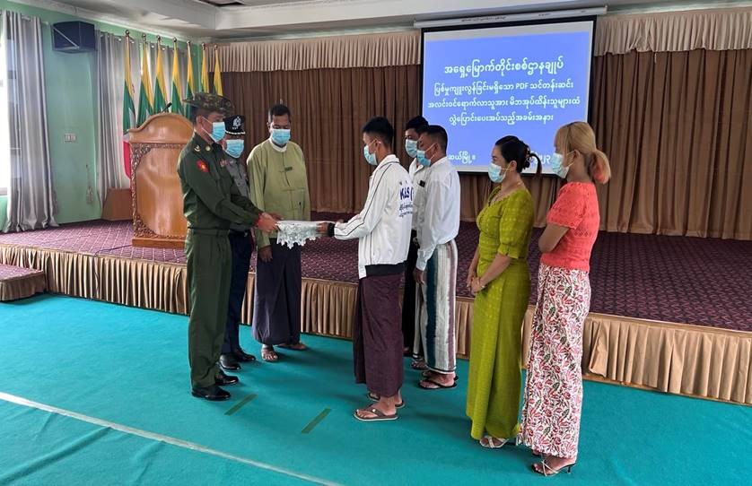 တိုင်းရင်းသားလက်နက်ကိုင်အဖွဲ့နယ်မြေအတွင်း သင်တန်းများတက်ရောက်ခဲ့ပြီး ပြစ်မှုကျူးလွန်ခြင်း မရှိခဲ့သည့် ဥပဒေဘောင်အတွင်း ဝင်ရောက်လာသော PDF အဖွဲ့ဝင်များအား ပြန်လည်ကြိုဆိုလက်ခံ၍ ၎င်း၏ မိဘအုပ်ထိန်းသူများထံသို့ လွှဲပြောင်းပေးအပ်လျက်ရှိသည်။