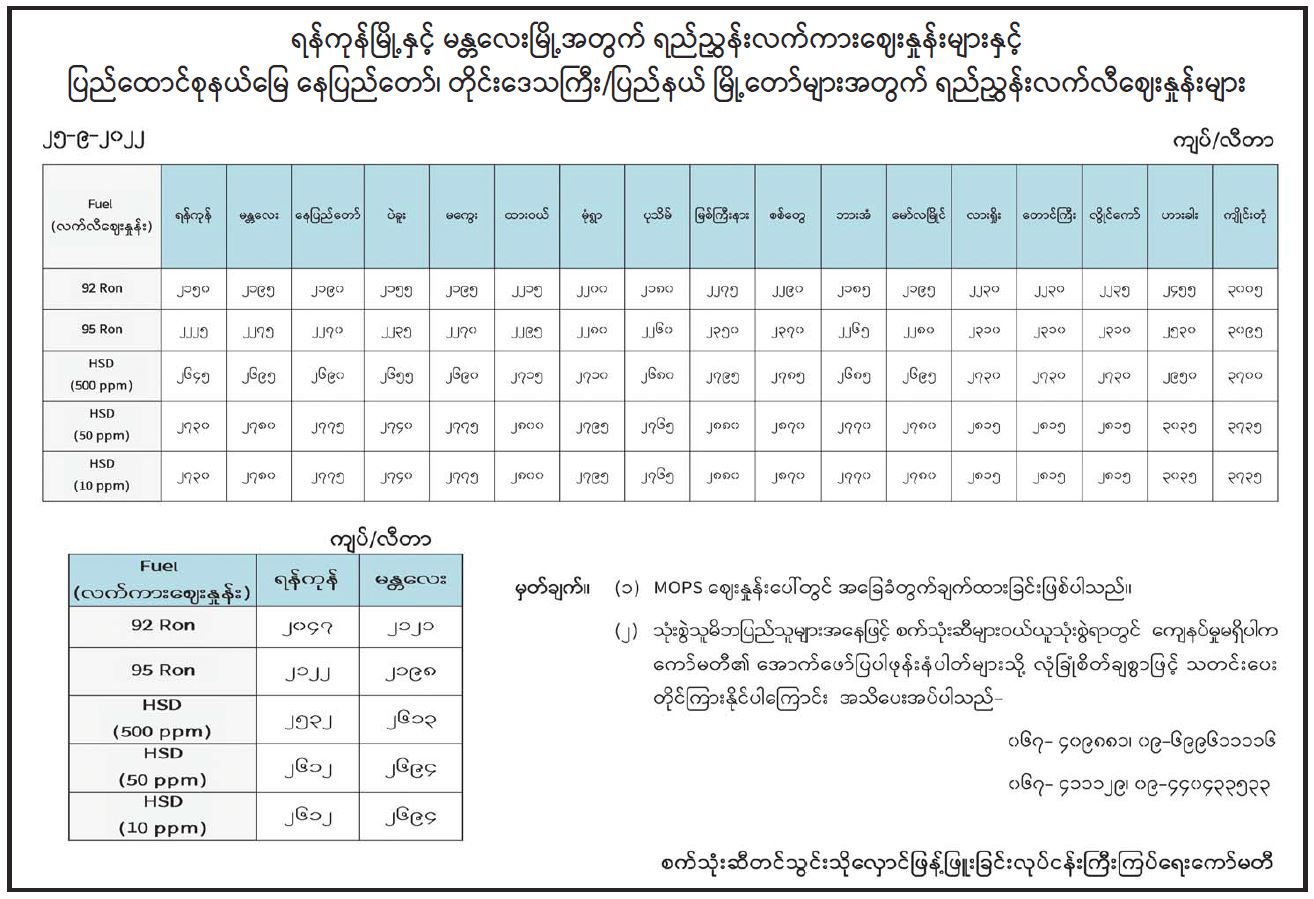 ရန်ကုန်မြို့နှင့် မန္တလေးမြို့အတွက် ရည်ညွှန်းလက်ကားဈေးနှုန်းများနှင့် ပြည်ထောင်စုနယ်မြေ နေပြည်တော်၊ တိုင်းဒေသကြီး/ ပြည်နယ် မြို့တော်များအတွက် ရည်ညွှန်းလက်လီဈေးနှုန်းများ