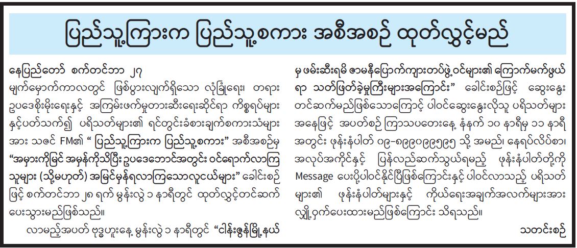 ပြည်သူ့ကြားက ပြည်သူ့စကား အစီအစဉ် ထုတ်လွှင့်မည်