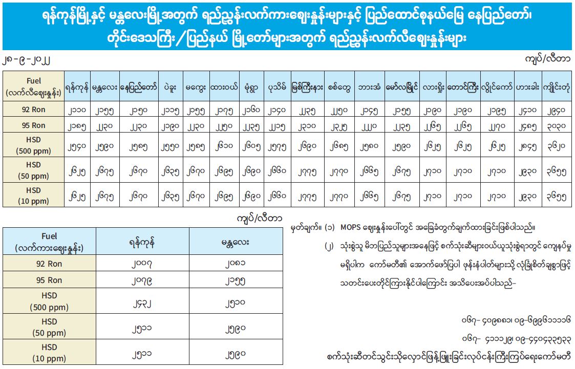 ရန်ကုန်မြို့နှင့် မန္တလေးမြို့အတွက် ရည်ညွှန်းလက်ကားဈေးနှုန်းများနှင့် ပြည်ထောင်စုနယ်မြေ နေပြည်တော်၊ တိုင်းဒေသကြီး/ ပြည်နယ် မြို့တော်များအတွက် ရည်ညွှန်းလက်လီဈေးနှုန်းများ 09/28/2022