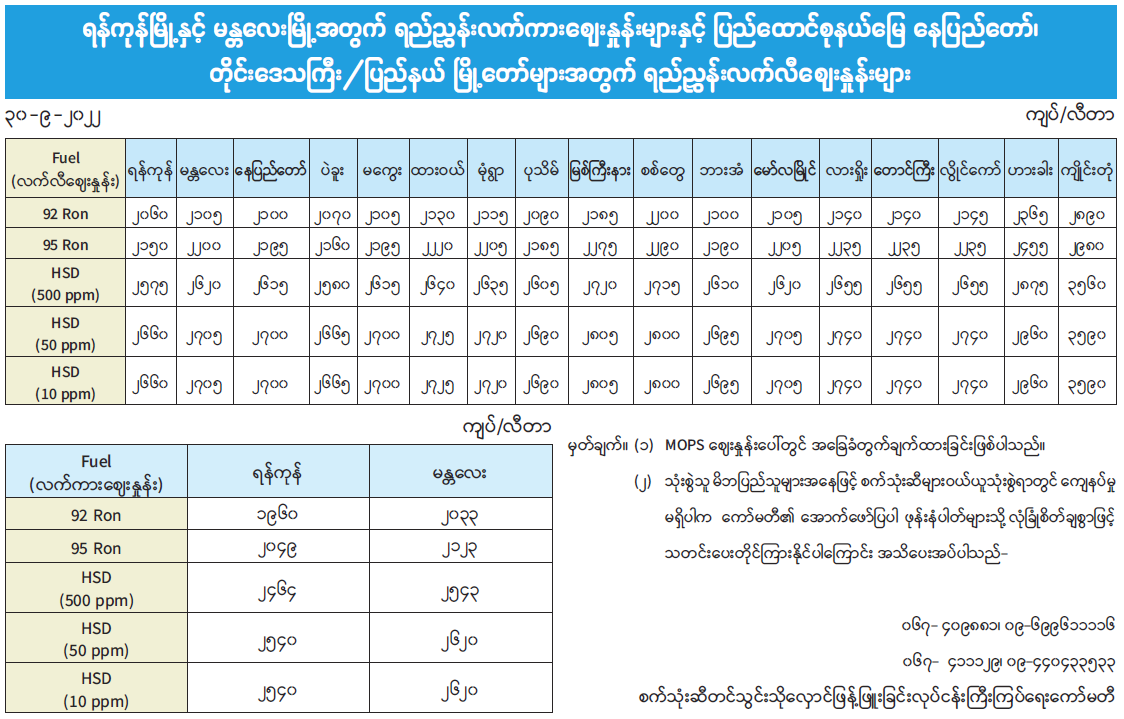 ရန်ကုန်မြို့နှင့် မန္တလေးမြို့အတွက် ရည်ညွှန်းလက်ကားဈေးနှုန်းများနှင့် ပြည်ထောင်စုနယ်မြေ နေပြည်တော်၊ တိုင်းဒေသကြီး/ ပြည်နယ် မြို့တော်များအတွက် ရည်ညွှန်းလက်လီဈေးနှုန်းများ 09/30/2022