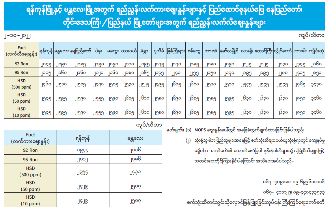 ရန်ကုန်မြို့နှင့် မန္တလေးမြို့အတွက် ရည်ညွှန်းလက်ကား ဈေးနှုန်းများနှင့် ပြည်ထောင်စုနယ်မြေ နေပြည်တော်၊ တိုင်းဒေသကြီး/ပြည်နယ် မြို့တော်များအတွက် ရည်ညွှန်းလက်လီဈေးနှုန်းများ 10/02/2022