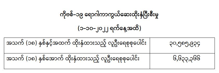 COVID-19 ရောဂါ ကာကွယ်ထိန်းချုပ်ရေးအတွက် တိုင်းဒေသကြီး/ပြည်နယ်များတွင် COVID-19 ရောဂါကာကွယ်ဆေးကို ဦးတည်အုပ်စုများသတ်မှတ်၍ ထိုးနှံပေးလျက်ရှိရာ (၁-၁၀-၂၀၂၂) ရက်နေ့အထိ အသက် (၁၈) နှစ်နှင့်အထက် လူဦးရေစုစုပေါင်း (၃၀,၅၈၅,၉၃၄) ဦးနှင့် အသက် (၁၈) နှစ်အောက် လူဦးရေစုစုပေါင်း (၆,၆၃၃,၃၆၆) ဦးတို့အား ထိုးနှံထားရှိပြီး ဖြစ်ပါသည်။