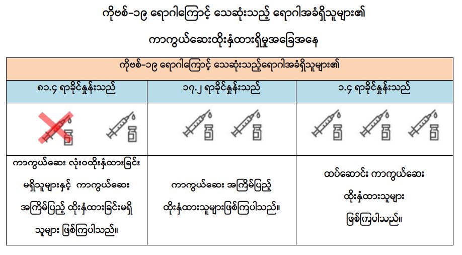 သို့ဖြစ်ပါ၍ မြန်မာနိုင်ငံတွင် ကိုဗစ်-၁၉ ရောဂါကြောင့် သေဆုံးသူများအတွင်း နာတာရှည် ရောဂါ ရောဂါအခံရှိသူများ၏ ကာကွယ်ဆေးထိုးနှံမှု အခြေအနေကို လေ့လာသုံးသပ်ချက်အရ အဆိုပါ ပုဂ္ဂိုလ်များအနက် ကာကွယ်ဆေးအကြိမ်ပြည့် ထိုးနှံထားသူများနှင့် ထပ်ဆောင်းကာကွယ်ဆေး ထိုးနှံထားသူများတွင် ကိုဗစ်-၁၉ ရောဂါကြောင့် သေဆုံးမှုကို သိသာစွာ လျှော့ချနိုင်ကြောင်းကို တွေ့ရှိရသည်ဖြစ်ရာ ဆီးချို၊ သွေးတိုး၊ နှလုံး၊ အသည်း၊ ကျောက်ကပ်၊ အဆုတ်၊ ကင်ဆာရောဂါ စသည်တို့ ကဲ့သို့သော နာတာရှည်ရောဂါအခံတစ်ခုခုရှိသူ ပြည်သူများအနေဖြင့် ကိုဗစ်-၁၉ ရောဂါကာကွယ်ရေး စည်းမျဉ်းစည်းကမ်းများကို တိကျစွာလိုက်နာခြင်း၊ ပါးစပ်နှင့် နှာခေါင်းစည်း (Mask) ကို စနစ်တကျ တပ်ဆင်ခြင်းတို့အပြင် နီးစပ်ရာ ကျန်းမာရေးဌာနများ၊ ကျေးရွာ/ ရပ်ကွက် အုပ်ချုပ်ရေးမှူးရုံးများနှင့် ဆက်သွယ်၍ ကိုဗစ်-၁၉ ရောဂါကာကွယ်ဆေး ထိုးနှံမှုနှင့် ထပ်ဆောင်းကာကွယ်ဆေးများ ထိုးနှံခြင်းတို့ကို မပျက်မကွက် ဆောင်ရွက်ကြပါရန် အသိပေးနှိုးဆော်အပ်ပါသည်။