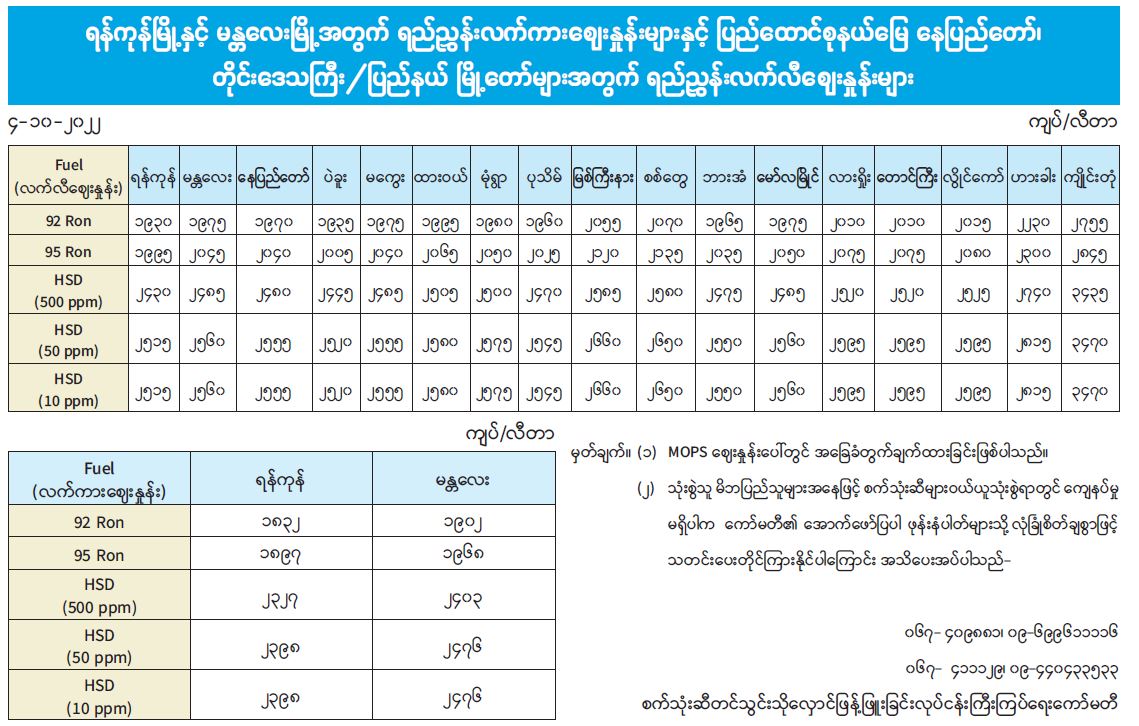 ရန်ကုန်မြို့နှင့် မန္တလေးမြို့အတွက် ရည်ညွှန်းလက်ကားဈေးနှုန်းများနှင့် ပြည်ထောင်စုနယ်မြေ နေပြည်တော်၊ တိုင်းဒေသကြီး/ပြည်နယ် မြို့တော်များအတွက် ရည်ညွှန်းလက်လီဈေးနှုန်းများ 10/04/2022