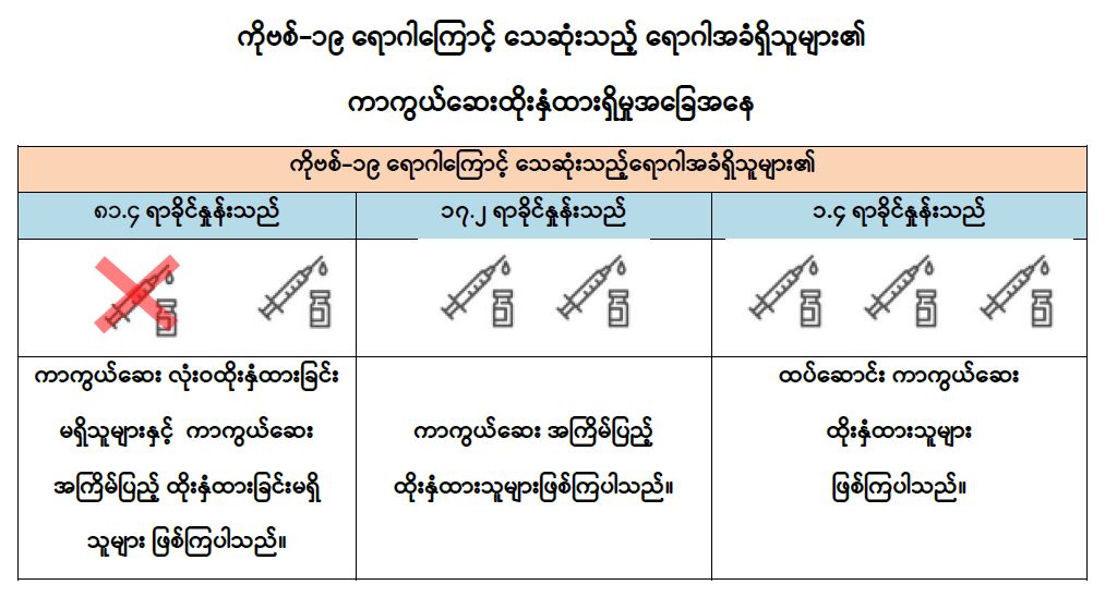 သို့ဖြစ်ပါ၍ ကိုဗစ်-၁၉ ရောဂါကူးစက်ခံရပါက အသက်အန္တရာယ်ဆုံးရှုံးနိုင်ခြေ ပိုမိုများ ပြားသည့် ဆီးချို၊ သွေးတိုး၊ နှလုံး၊ အသည်း၊ ကျောက်ကပ်၊ အဆုတ်၊ ကင်ဆာရောဂါစသည့် နာတာရှည်ရောဂါအခံတစ်ခုခု ရှိသူများအနေဖြင့် ကိုဗစ်-၁၉ရောဂါ ကာကွယ်ဆေးထိုးနှံမှုကို မပျက် မကွက်ခံယူကြပါရန်နှင့် ၎င်းတို့၏မိသားစုဝင်များ၊ မိတ်ဆွေများမှလည်း အဆိုပါနာတာရှည်ရောဂါ အခံတစ်ခုခုရှိသူများ အနေဖြင့် ကိုဗစ်-၁၉ ရောဂါ ကာကွယ်ဆေးထိုးနှံမှုများကိုအကြိမ်ပြည့် ထိုးနှံမှုခံယူရေးနှင့် ထပ်ဆောင်းကာကွယ်ဆေးများကို မပျက်မကွက်ထိုးနှံမှု ခံယူနိုင်ရေး အတွက် နီးစပ်ရာကာကွယ်ဆေးထိုးစုရပ်များ၊ ကျန်းမာရေးဌာနများ၊ ရပ်ကွက်/ကျေးရွာ အုပ်ချုပ်ရေးမှူးရုံးများနှင့် မပျက်မကွက် ဆက်သွယ် ဆောင်ရွက်ကြပါရန်တိုက်တွန်းအပ်ပါသည်။