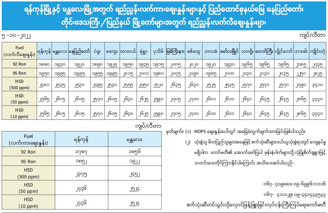 ရန်ကုန်မြို့နှင့် မန္တလေးမြို့အတွက် ရည်ညွှန်းလက်ကားဈေးနှုန်းများနှင့် ပြည်ထောင်စုနယ်မြေ နေပြည်တော်၊ တိုင်းဒေသကြီး/ ပြည်နယ်မြို့တော်များအတွက် ရည်ညွှန်းလက်လီဈေးနှုန်းများ