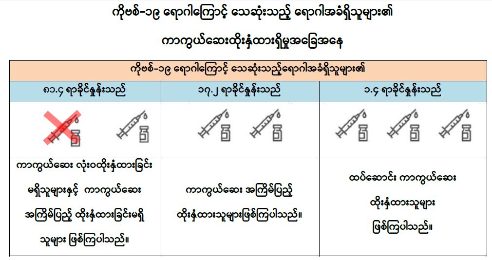 သို့ဖြစ်ပါ၍ ကိုဗစ်-၁၉ ရောဂါကူးစက်ခံရပါက အသက်အန္တရာယ်ဆုံးရှုံးနိုင်ခြေ ပိုမိုများပြားသည့် ဆီးချို၊ သွေးတိုး၊ နှလုံး၊ အသည်း၊ ကျောက်ကပ်၊ အဆုတ်၊ ကင်ဆာရောဂါစသည့် နာတာရှည် ရောဂါအခံတစ်ခုခု ရှိသူများအနေဖြင့် ကိုဗစ်-၁၉ ရောဂါကာကွယ်ဆေးထိုးနှံမှုကို မပျက်မကွက်ခံယူကြပါရန်နှင့် ၎င်းတို့၏မိသားစုဝင်များ၊ မိတ်ဆွေများမှလည်း အဆိုပါ နာတာရှည်ရောဂါအခံတစ်ခုခုရှိသူများအနေဖြင့် ကိုဗစ်-၁၉ ရောဂါကာကွယ်ဆေးထိုးနှံမှုများကို အကြိမ်ပြည့်ထိုးနှံမှုခံယူရေးနှင့် ထပ်ဆောင်းကာကွယ်ဆေးများကို မပျက်မကွက်ထိုးနှံမှုခံယူနိုင်ရေးအတွက် နီးစပ်ရာကာကွယ်ဆေးထိုးစုရပ်များ၊ ကျန်းမာရေးဌာနများ၊ ရပ်ကွက်/ ကျေးရွာ အုပ်ချုပ်ရေးမှူးရုံးများနှင့် မပျက်မကွက် ဆက်သွယ်ဆောင်ရွက်ကြပါရန် တိုက်တွန်းအပ်ပါသည်။