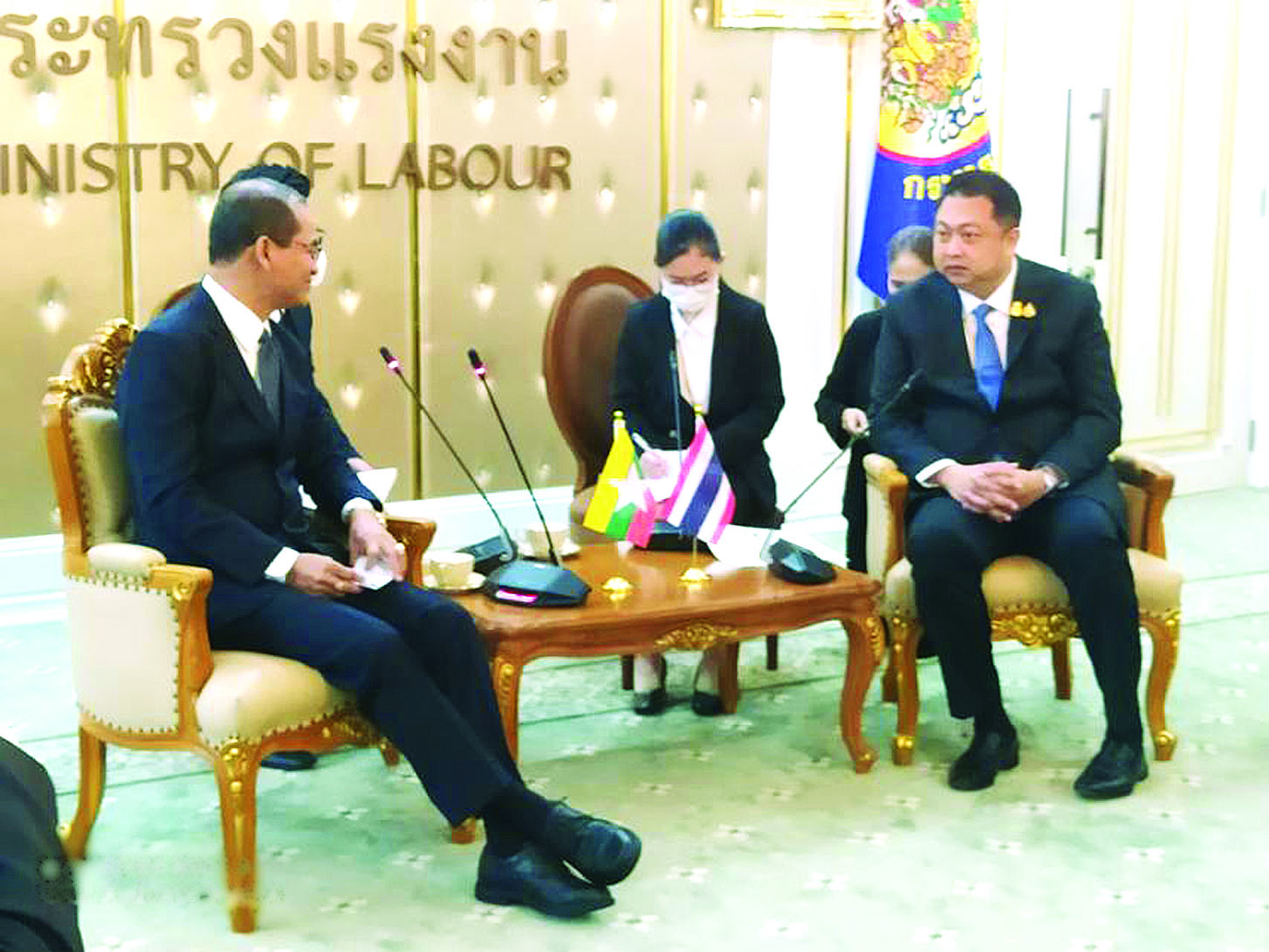 အလုပ်သမားဝန်ကြီးဌာနဒုတိယဝန်ကြီး ဦးဝင်းရှိန် ဦးဆောင်သည့် မြန်မာကိုယ်စားလှယ်အဖွဲ့သည် ယနေ့နံနက်ပိုင်းတွင် ထိုင်းနိုင်ငံ ဗန်ကောက်မြို့၌ ထိုင်းအလုပ်သမားဝန်ကြီးဌာနဝန်ကြီး Mr. Suchart Chomklin နှင့် တာဝန်ရှိသူများကို သွားရောက်တွေ့ဆုံသည်။