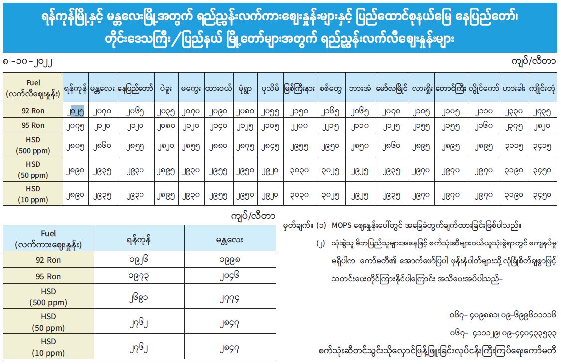 ရန်ကုန်မြို့နှင့် မန္တလေးမြို့အတွက် ရည်ညွှန်းလက်ကားဈေးနှုန်းများနှင့် ပြည်ထောင်စုနယ်မေ နေပြည်တော်၊ တိုင်ဒေသကြီး/ပြည်နယ် မြို့တော်များအတွက် ရည်ညွှန်းလက်လီဈေးနှုန်းများ