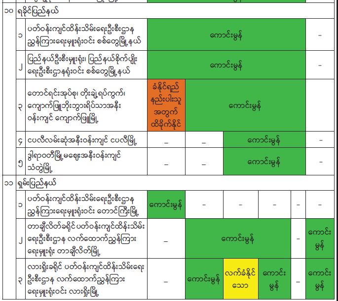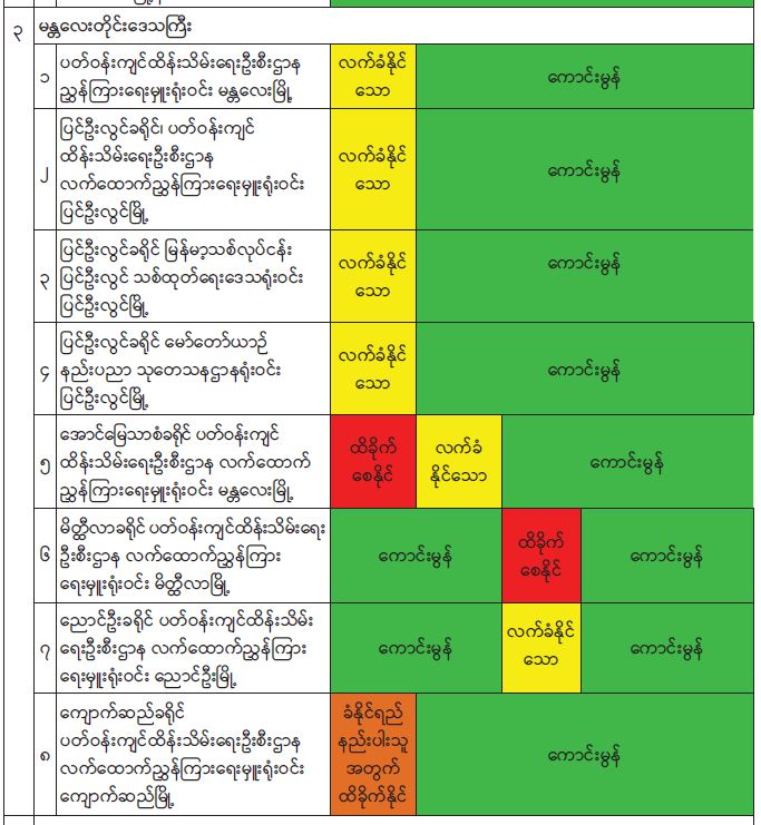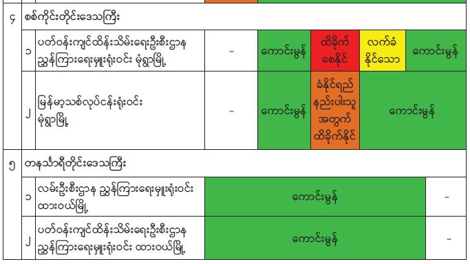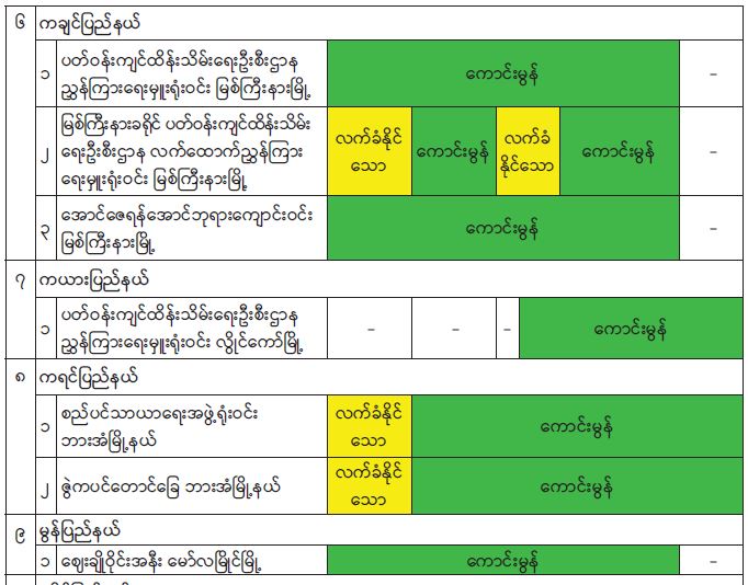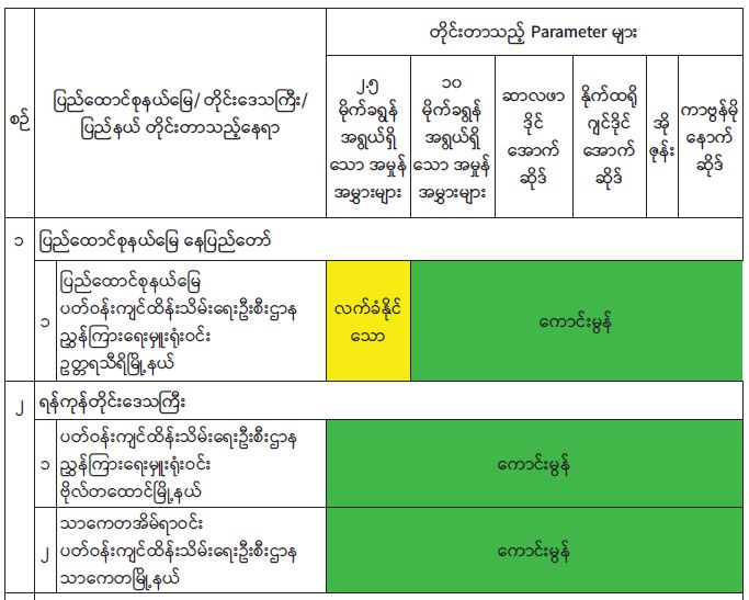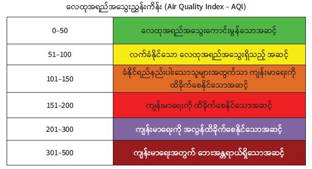 ၂၀၂၂ ခုနှစ် စက်တင်ဘာလအတွင်း နေပြည်တော်၊ ရန်ကုန်မြို့၊ မန္တလေးမြို့၊ မုံရွာမြို့၊ ထားဝယ်မြို့၊ မြစ်ကြီးနားမြို့၊ လွိုင်ကော်မြို့၊ ဘားအံမြို့၊ မော်လမြိုင်မြို့၊ စစ်တွေမြို့၊ တာချီလိတ်မြို့နှင့် လားရှိုးမြို့တို့တွင် တိုင်းတာရရှိသည့် ဝန်းကျင်လေထုအရည်အသွေးရလဒ်များအား Air Quality Index (AQI) ဖြင့် တွက်ချက်ထားမှုအရ အောက်ပါအတိုင်း လေ့လာဆန်းစစ်တွေ့ရှိရပါသည်-