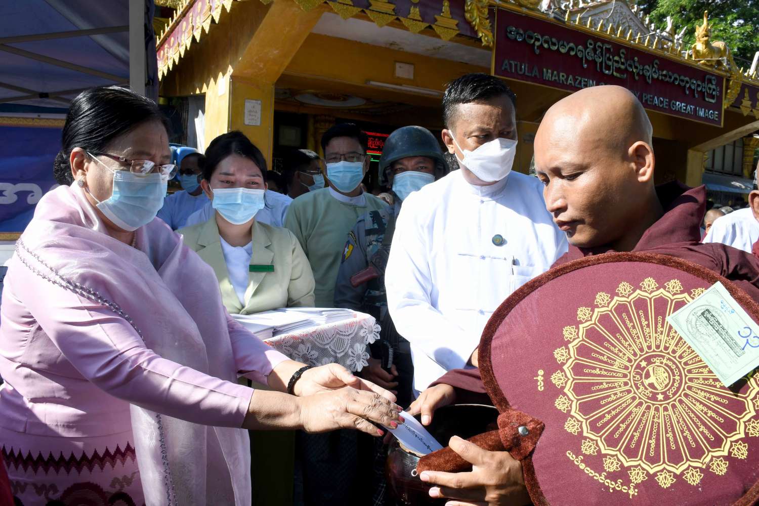 ဦးစွာ နိုင်ငံတော် စီမံအုပ်ချုပ်ရေး ကောင်စီဝင် ဒေါ်အေးနုစိန်သည် ပြည်နယ်ဝန်ကြီးချုပ်၊ ပြည်နယ်အစိုးရ အဖွဲ့ဝင်များနှင့်အတူ အတုလမာရဇိန် ပြည်လုံးချမ်းသာ ဘုရားကြီးအား ဖူးမြော်ကြည်ညိုပြီး ပန်း၊ ဆီမီးများ ဆက်ကပ်လှူဒါန်းကြသည်။