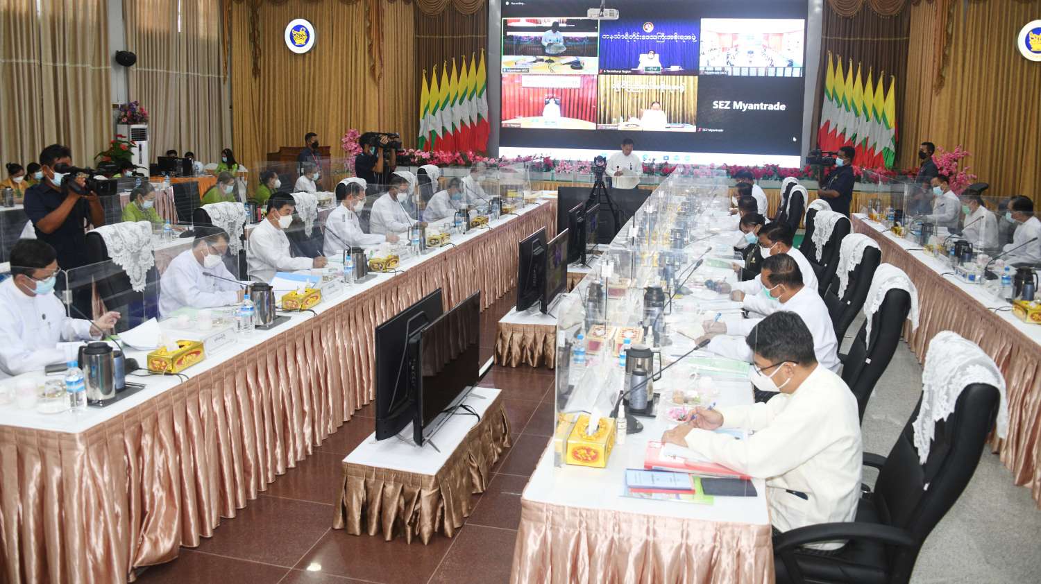 ထို့နောက် ပြည်ထောင်စုဝန်ကြီးများ ဖြစ်ကြသည့် ဗိုလ်ချုပ်ကြီးတင်အောင်စန်း၊ ဦးဝင်းရှိန်၊ ဒေါက်တာကံဇော်၊ ဦးကိုကိုလှိုင်၊ ဒေါက်တာသီတာဦး၊ ဦးတင်ထွဋ်ဦး၊ ဦးခင်မောင်ရီ၊ ဒေါက်တာချာလီသန်း၊ ဒေါက်တာပွင့်ဆန်းနှင့် ဦးရွှေလေး၊ တိုင်းဒေသကြီး ဝန်ကြီးချုပ်များဖြစ်ကြသည့် ဦးစိုးသိန်းနှင့် ဦးမြတ်ကို၊ လျှပ်စစ်စွမ်းအား ဝန်ကြီးဌာန ဒုတိယဝန်ကြီး ဒေါက်တာအောင်ဇေယျ၊ ရခိုင်ပြည်နယ် စီးပွားရေးရာဝန်ကြီးတို့က အထူးစီးပွားရေးဇုန်များအလိုက် လုပ်ငန်းဆောင်ရွက်နေမှုဆိုင်ရာ ကိစ္စများနှင့်ပတ်သက်၍ သက်ဆိုင်ရာကဏ္ဍများအလိုက် ဆွေးနွေး တင်ပြကြသည်။