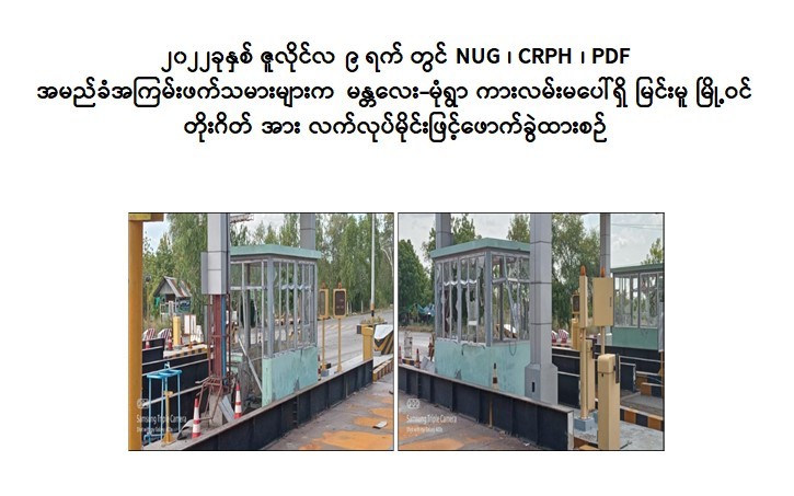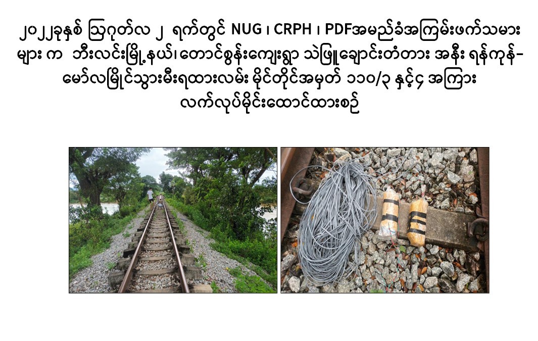 နိုင်ငံတော်အစိုးရအနေဖြင့် ဒေသဖွံ့ဖြိုးတိုးတက်ရေး၊ လမ်းပန်းဆက်သွယ် လွယ်ကူချောမွေ့စေရေးဆောင်ရွက်နေမှုများအပေါ် PDF အမည်ခံ အကြမ်းဖက် သမားများက ယခုကဲ့သို့ လမ်း၊ တံတားများအား မိုင်းထောင်ဖောက်ခွဲ၊ မီးရှို့ဖျက်ဆီးခြင်းများ လုပ်ဆောင်နေမှုအပေါ် ပြည်သူလူထု တစ်ရပ်လုံးအနေဖြင့် ပူးပေါင်းကာကွယ် သွားကြပါရန်နှင့် အကြမ်းဖက်သမားများ၏ လှုပ်ရှားမှုသတင်းများ ရရှိပါက နီးစပ်ရာလုံခြုံရေး တပ်ဖွဲ့ဝင်များထံသို့ လျှို့ဝှက်စွာ ဆက်သွယ် သတင်းပေးပို့ကာ အကြမ်းဖက်သမားများ ရပ်တည်မှု မရှိနိုင်သည်အထိ ဝိုင်းဝန်းပူးပေါင်း ဆောင်ရွက်သွားကြပါရန် မေတ္တာရပ်ခံ သတင်းထုတ်ပြန်အပ်ပါသည်။