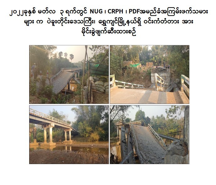 ထို့ပြင် ဒေသတွင်းဖွံ့ဖြိုး တိုးတက်ရေး၊ လမ်းပန်းဆက်သွယ် လွယ်ကူချောမွေ့စေရေး တို့အတွက် အစိုးရအဆက်ဆက် နိုင်ငံတော်ဘဏ္ဍာငွေများ အမြောက်အများ အသုံးပြုပြီး အချိန်ကာလကြာရှည်စွာ တည်ဆောက်ထားသည့် လမ်း၊ တံတားများကို PDF အမည်ခံ အကြမ်းဖက်သမားများက မိုင်းထောင်ဖောက်ခွဲ၊ မီးရှို့ ဖျက်ဆီးခြင်းများကို လုပ်ဆောင်လျက်ရှိသည်။
