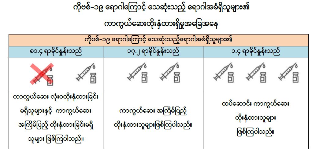 သို့ဖြစ်ပါ၍ ကိုဗစ်-၁၉ ရောဂါကူးစက်ခံရပါက အသက်အန္တရာယ်ဆုံးရှုံးနိုင်ခြေ ပိုမိုများပြားသည့် ဆီးချို၊ သွေးတိုး၊ နှလုံး၊ အသည်း၊ ကျောက်ကပ်၊ အဆုတ်၊ ကင်ဆာရောဂါစသည့် နာတာရှည် ရောဂါအခံတစ်ခုခုရှိသူများအနေဖြင့် ကိုဗစ်-၁၉ ရောဂါ ကာကွယ်ဆေးထိုးနှံမှုကို မပျက်မကွက်ခံယူကြပါရန်နှင့် ၎င်းတို့၏မိသားစုဝင်များ၊ မိတ်ဆွေများမှလည်း အဆိုပါ နာတာရှည်ရောဂါအခံ တစ်ခုခုရှိသူများအနေဖြင့် ကိုဗစ်-၁၉ ရောဂါကာကွယ်ဆေးထိုးနှံမှုများကို အကြိမ်ပြည့်ထိုးနှံမှုခံယူရေးနှင့် ထပ်ဆောင်းကာကွယ်ဆေးများကို မပျက်မကွက်ထိုးနှံမှုခံယူနိုင်ရေးအတွက် နီးစပ်ရာကာကွယ်ဆေးထိုးစုရပ်များ၊ ကျန်းမာရေးဌာနများ၊ ရပ်ကွက်/ ကျေးရွာ အုပ်ချုပ်ရေးမှူးရုံးများနှင့် မပျက်မကွက် ဆက်သွယ်ဆောင်ရွက်ကြပါရန် တိုက်တွန်းအပ်ပါသည်။