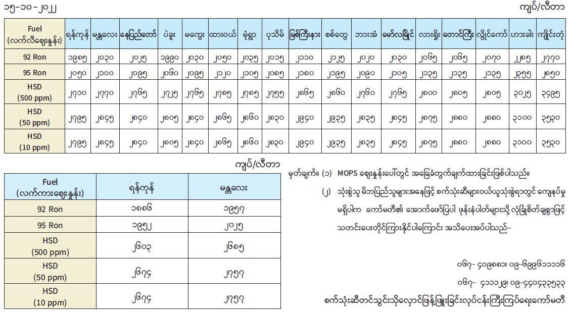 ရန်ကုန်မြို့နှင့် မန္တလေးမြို့အတွက် ရည်ညွှန်းလက်ကားဈေးနှုန်းများနှင့် ပြည်ထောင်စုနယ်မြေ နေပြည်တော်၊ တိုင်းဒေသကြီး/ပြည်နယ် မြို့တော်များအတွက် ရည်ညွှန်းလက်လီဈေးနှုန်းများ