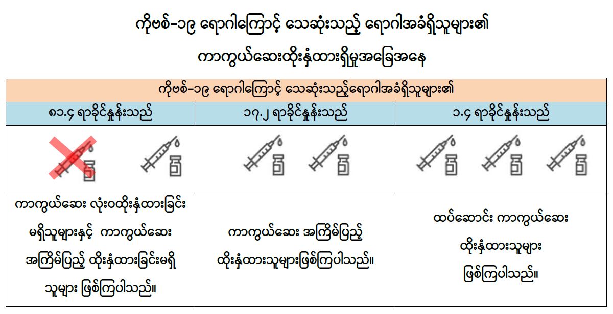သို့ဖြစ်ပါ၍ ကိုဗစ်-၁၉ ရောဂါကူးစက်ခံရပါက အသက်အန္တရာယ်ဆုံးရှုံးနိုင်ခြေ ပိုမိုများပြားသည့် ဆီးချို၊ သွေးတိုး၊ နှလုံး၊ အသည်း၊ ကျောက်ကပ်၊ အဆုတ်၊ ကင်ဆာရောဂါစသည့် နာတာရှည် ရောဂါအခံတစ်ခုခု ရှိသူများအနေဖြင့် ကိုဗစ်-၁၉ ရောဂါ ကာကွယ်ဆေးထိုးနှံမှုကို မပျက်မကွက် ခံယူကြပါရန်နှင့် ၎င်းတို့၏မိသားစုဝင်များ၊ မိတ်ဆွေများမှလည်း အဆိုပါ နာတာရှည်ရောဂါအခံ တစ်ခုခုရှိသူများအနေဖြင့် ကိုဗစ်-၁၉ရောဂါ ကာကွယ်ဆေးထိုးနှံမှုများကို အကြိမ်ပြည့်ထိုးနှံမှုခံယူရေးနှင့်ထပ်ဆောင်းကာကွယ်ဆေးများကို မပျက်မကွက်ထိုးနှံမှုခံယူနိုင်ရေးအတွက် နီးစပ်ရာ ကာကွယ်ဆေးထိုးစုရပ်များ၊ ကျန်းမာရေးဌာနများ၊ ရပ်ကွက်/ကျေးရွာအုပ်ချုပ်ရေးမှူးရုံးများနှင့် မပျက်မကွက် ဆက်သွယ်ဆောင်ရွက်ကြပါရန် တိုက်တွန်းအပ်ပါသည်။