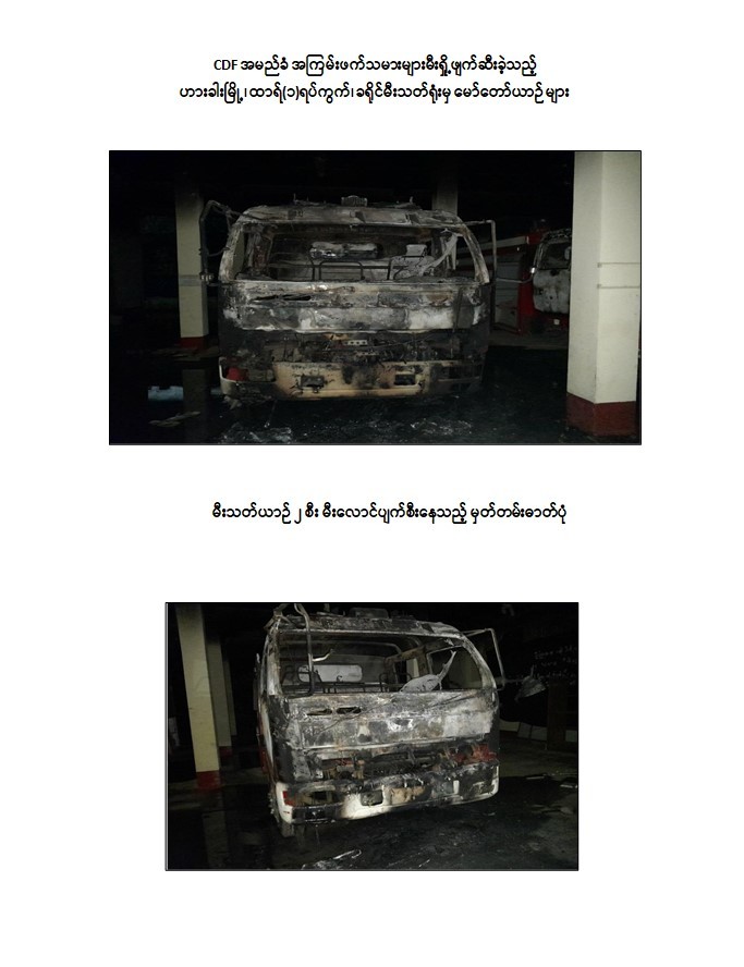 ထိုသို့ ပြုလုပ်လျက်ရှိရာ ယနေ့နံနက် ၃ နာရီခန့်တွင် ချင်းပြည်နယ်၊ ဟားခါးမြို့၊ ထာရ်(၁)ရပ်ကွက်ရှိ ခရိုင်မီးသတ်ရုံးအား CDF အမည်ခံအကြမ်းဖက်သမားများက လက်နက်ကြီး၊ လက်နက်ငယ်များဖြင့် အကြောင်းမဲ့လာရောက်ပစ်ခတ်တိုက်ခိုက်ပြီး မော်တော်ယာဉ်များအား မီးရှို့ခဲ့သဖြင့် အဆိုပါအနီးတစ်ဝိုက် လုံခြုံရေးဆောင်ရွက်နေသော တပ်ဖွဲ့ဝင်များက ပြန်လည်ပစ်ခတ်တိုက်ခိုက်ခဲ့ရာ အပြန်အလှန်ထိတွေ့မှုဖြစ်ပွားခဲ့ပြီး အကြမ်းဖက်သမားများ အနောက်မြောက်ဘက်သို့ ဆုတ်ခွာထွက်ပြေးသွားခဲ့ကြောင်း၊ ထိုသို့ ပစ်ခတ်တိုက်ခိုက်မီးရှို့ဖျက်ဆီးမှုကြောင့် မီးသတ်ရုံးအတွင်းရှိ မီးသတ်ယာဉ် ၂ စီး မီးလောင်ပျက်စီးခဲ့ကြောင်း သိရှိရသည်။