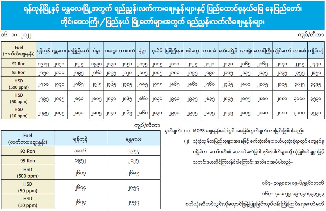 ရန်ကုန်မြို့နှင့် မန္တလေးမြို့အတွက် ရည်ညွှန်းလက်ကားဈေးနှုန်းများနှင့် ပြည်ထောင်စုနယ်မြေ နေပြည်တော်၊ တိုင်းဒေသကြီး/ပြည်နယ် မြို့တော်များအတွက် ရည်ညွှန်းလက်လီဈေးနှုန်းများ 10/16/2022
