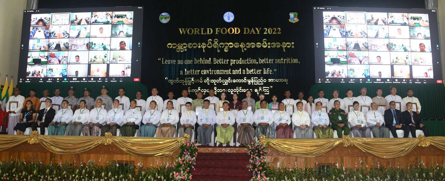 ကမ္ဘာ့စားနပ်ရိက္ခာနှင့် စိုက်ပျိုးရေးအဖွဲ့ကြီး၏ ယခုနှစ်ကမ္ဘာ့စားနပ်ရိက္ခာနေ့ ဆောင်ပုဒ်မှာ "Leave no one behind. Better Production, Better Nutrition, a Better Environment and a Better Life" "ထွက်ကုန်မြှင့်တင်တိုးထုတ်လျှင် ကောင်းမွန်ပြည့်ဝ အာဟာရ၊ ဝန်းကျင်လှပ တို့ဘဝ၊ လူတိုင်းစေ့ငှရရှိကြ" ဟု ချမှတ် တိုက်တွန်းနှိုးဆော်ထားကြောင်း။