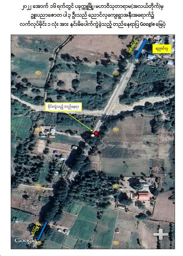 ၂၀၂၂ ခုနှစ်၊ အောက်တိုဘာလ ၁၆ ရက် မွန်းလွဲ ၂ နာရီတွင် ပခုက္ကူမြို့၊ အမှတ် (၁၂) ရပ်ကွက်၊ မဟာဝိသုတာရာမ (အလယ်တိုက်)ရှိ သာသနာ့ဝံသကျောင်းမှ ဥူးပညာဇောတ၊ သက်တော် ၃၄ နှစ်၊ ဝါတော် ၁၄ ဝါ၊ (ဘ)ဦးစံမြင့်၊ ဥူးနန္ဒာစရိယ၊ သက်တော် ၃၃ နှစ်၊ ဝါတော် ၁၃ ဝါ၊ (ဘ)ဦးပြုံး၊ ဥူးဣန္ဒြာစရိယ၊ သက်တော် ၃၃ နှစ်၊ ဝါတော် ၁၃ ဝါ၊ (ဘ)ဦးအောင်လွင်၊ ဥူးဝိစာရ၊ သက်တော် ၃၂ နှစ်၊ ဝါတော် ၁၂ ဝါ၊ (ဘ)ဦးမောင်ငွေတို့ ပါဝင်သည့် သံဃာတော် ၄ ပါးသည် ယာဉ်အမှတ်၊ MDY-RLG-1472 အမျိုးအစား NISSAN အနက်ရောင်ယာဉ်ဖြင့် ပခုက္ကူမြို့နယ်၊ ပေါက်တောကျေးရွာရှိ ဥူးပညာဇောတ၏ နေအိမ်သို့ အလည်သွားရောက်ရန် ဥူးပညာဇောတ မောင်းနှင်ပြီး ပခုက္ကူမြို့မှတစ်ဆင့် ပခုက္ကူ-ဆိပ်ဖြူ သွားကားလမ်းအတိုင်း သွားရောက်စဉ် ညောင်လှကျေးရွာအဝင် မီတာ ၅၀ ခန့်ကွာအရောက်၌ လမ်း၏ ယာဘက် ၅ ပေခန့်အကွာမှ PDF အမည်ခံ အကြမ်းဖက်သမားများ ထောင်ထားသည့် လက်လုပ်မိုင်း ၁ လုံးအား နင်းမိ ပေါက်ကွဲခဲ့သည့် ဖြစ်စဉ် ဖြစ်ပွားခဲ့သည်။
