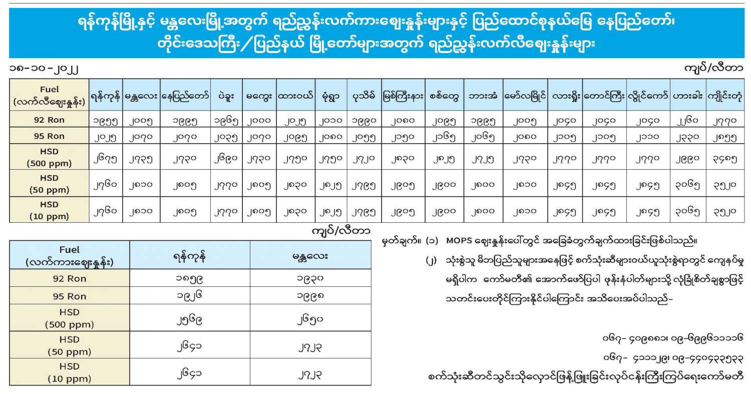 ရန်ကုန်မြို့နှင့် မန္တလေးမြို့အတွက် ရည်ညွှန်းလက်ကားဈေးနှုန်းများနှင့် ပြည်ထောင်စုနယ်မြေ နေပြည်တော်၊ တိုင်းဒေသကြီး/ပြည်နယ် မြို့တော်များအတွက် ရည်ညွှန်းလက်လီဈေးနှုန်းများ 10/18/2022