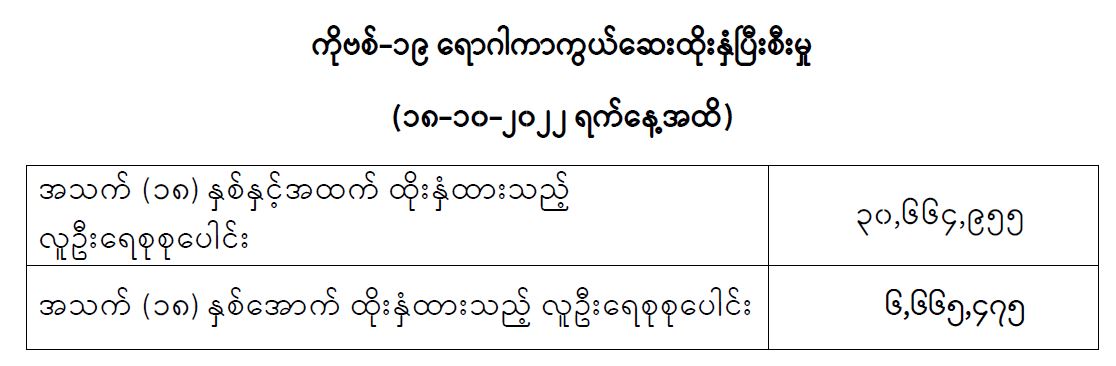COVID-19 ရောဂါ ကာကွယ် ထိန်းချုပ်ရေးအတွက် တိုင်းဒေသကြီး/ ပြည်နယ်များတွင် COVID-19 ရောဂါကာကွယ်ဆေးကို ဦးတည်အုပ်စုများ သတ်မှတ်၍ ထိုးနှံပေးလျက်ရှိရာ (၁၈-၁၀-၂၀၂၂) ရက်နေ့အထိ အသက် (၁၈)နှစ်နှင့်အထက် လူဦးရေ စုစုပေါင်း (၃၀,၆၆၄,၉၅၅) ဦးနှင့် အသက် (၁၈) နှစ် အောက် လူဦးရေစုစုပေါင်း (6,665,475) ဦး တို့အား ထိုးနှံထားရှိပြီး ဖြစ်ပါသည်။