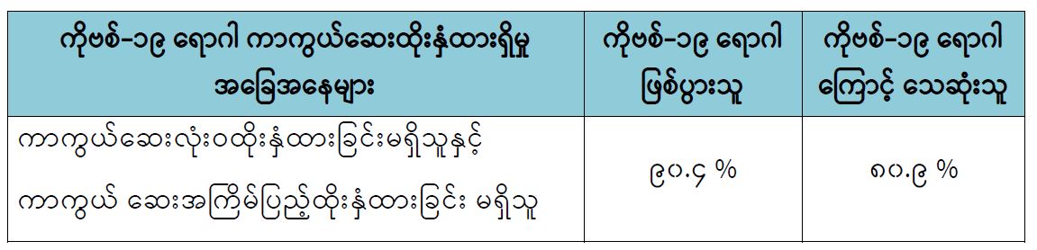 မြန်မာနိုင်ငံတွင် (၂၈-၁-၂၀၂၂) ရက်နေ့မှ (၁၅-၁၀-၂၀၂၂) ရက်နေ့အထိ တွေ့ရှိရသော ကိုဗစ်-၁၉ ရောဂါဖြစ်ပွားသူများနှင့် သေဆုံးသူများ၏ ကိုဗစ်-၁၉ ရောဂါကာကွယ်ဆေး ထိုးနှံထားရှိမှု အခြေအနေများကို ဆန်းစစ်ချက်အရ ကိုဗစ်-၁၉ ရောဂါဖြစ်ပွားသူ စုစုပေါင်း၏ (၉၀.၄) ရာခိုင်နှုန်းနှင့် ကိုဗစ်-၁၉ ရောဂါကြောင့် သေဆုံးသူ စုစုပေါင်း၏ (၈၀.၉) ရာခိုင်နှုန်း တို့မှာ ကာကွယ်ဆေး လုံးဝထိုးနှံထားခြင်း မရှိသူများနှင့် ကာကွယ်ဆေး အကြိမ်ပြည့် ထိုးနှံထားခြင်း မရှိသူများ ဖြစ်ကြောင်း တွေ့ရှိရပါသည်။