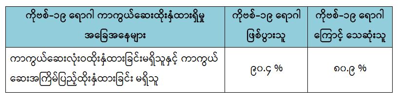 မြန်မာနိုင်ငံတွင် (၂၈-၁-၂၀၂၂) ရက်နေ့မှ (၁၅-၁၀-၂၀၂၂) ရက်နေ့အထိ တွေ့ရှိရသော ကိုဗစ်-၁၉ ရောဂါဖြစ်ပွားသူများနှင့် သေဆုံးသူများ၏ ကိုဗစ်-၁၉ ရောဂါကာကွယ်ဆေး ထိုးနှံထားရှိမှု အခြေအနေများကို ဆန်းစစ်ချက်အရ ကိုဗစ်-၁၉ ရောဂါဖြစ်ပွားသူ စုစုပေါင်း၏ (၉၀.၄) ရာခိုင်နှုန်းနှင့် ကိုဗစ်-၁၉ ရောဂါကြောင့် သေဆုံးသူစုစုပေါင်း၏ (၈၀.၉) ရာခိုင်နှုန်းတို့မှာ ကာကွယ်ဆေး လုံးဝထိုးနှံထားခြင်းမရှိသူများနှင့် ကာကွယ်ဆေးအကြိမ်ပြည့် ထိုးနှံထားခြင်း မရှိသူများ ဖြစ်ကြောင်း တွေ့ရှိရပါသည်။