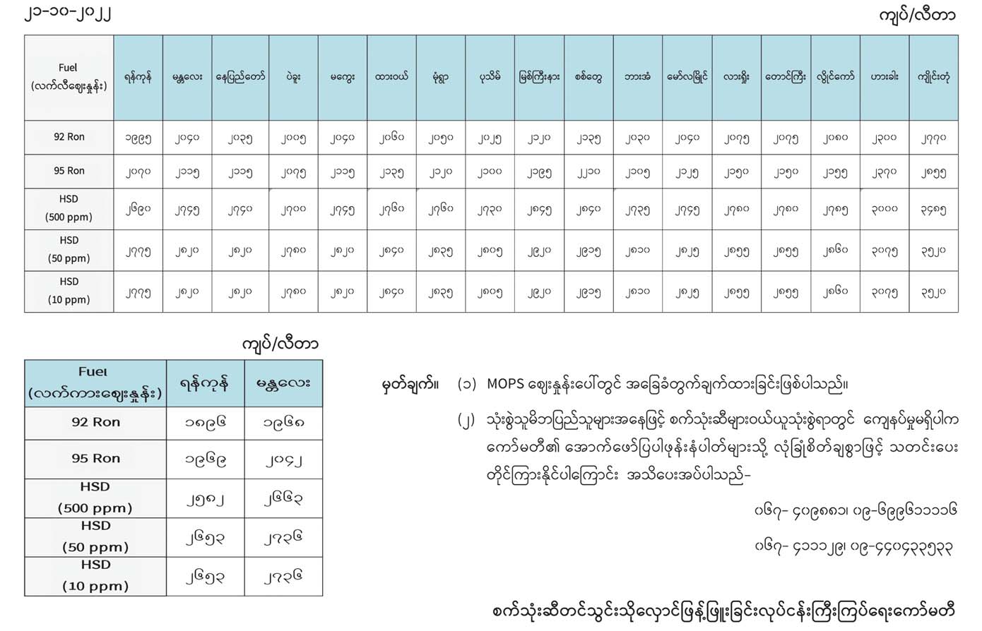 ရန်ကုန်မြို့နှင့် မန္တလေးမြို့အတွက် ရည်ညွှန်းလက်ကားဈေးနှုန်းများနှင့် ပြည်ထောင်စုနယ်မြေ နေပြည်တော်၊ တိုင်းဒေသကြီး/ပြည်နယ် မြို့တော်များအတွက် ရည်ညွှန်းလက်လီဈေးနှုန်းများ 10/21/2022