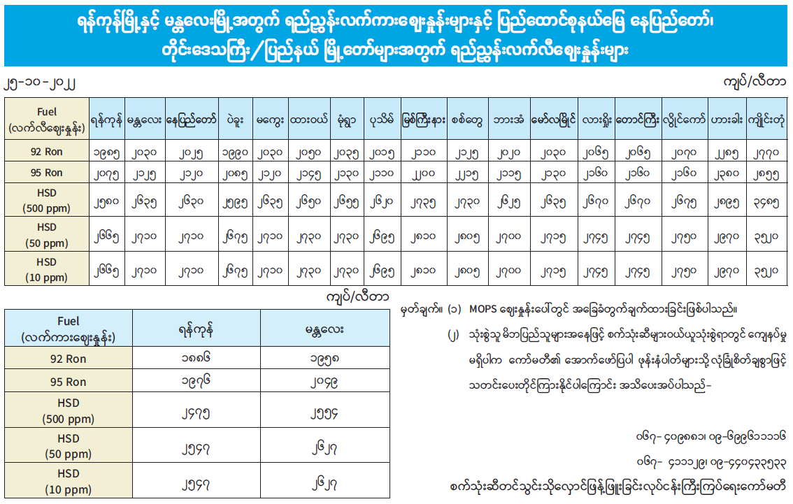 ရန်ကုန်မြို့နှင့် မန္တလေးမြို့အတွက် ရည်ညွှန်းလက်ကားဈေးနှုန်းများနှင့် ပြည်ထောင်စုနယ်မြေ နေပြည်တော်၊ တိုင်းဒေသကြီး/ပြည်နယ် မြို့တော်များအတွက် ရည်ညွှန်းလက်လီဈေးနှုန်းများ 10/25/2022