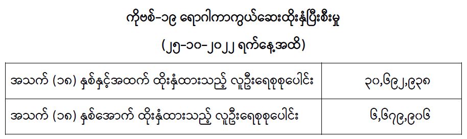 COVID-19 ရောဂါ ကာကွယ်ထိန်းချုပ်ရေးအတွက် တိုင်းဒေသကြီး/ပြည်နယ်များတွင် COVID-19 ရောဂါကာကွယ်ဆေးကို ဦးတည်အုပ်စုများသတ်မှတ်၍ ထိုးနှံပေးလျက်ရှိရာ (၂၅-၁၀-၂၀၂၂) ရက်နေ့အထိ အသက်(၁၈)နှစ်နှင့်အထက် လူဦးရေစုစုပေါင်း(၃၀,၆၉၂,၉၃၈) ဦးနှင့် အသက်(၁၈)နှစ်အောက် လူဦးရေစုစုပေါင်း (၆,၆၇၉,၉၀၆) ဦးတို့အား ထိုးနှံထားရှိပြီး ဖြစ်ပါသည်။