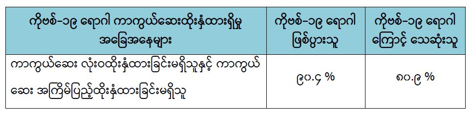 မြန်မာနိုင်ငံတွင် (၂၈-၁-၂၀၂၂) ရက်နေ့မှ (၁၅-၁၀-၂၀၂၂) ရက်နေ့အထိတွေ့ရှိရသော ကိုဗစ်-၁၉ ရောဂါဖြစ်ပွားသူများနှင့် သေဆုံးသူများ၏ ကိုဗစ်-၁၉ ရောဂါကာကွယ်ဆေး ထိုးနှံထားရှိမှုအခြေအနေများကို ဆန်းစစ်ချက်အရ ကိုဗစ်-၁၉ ရောဂါဖြစ်ပွားသူစုစုပေါင်း၏ (၉၀.၄) ရာခိုင်နှုန်းနှင့် ကိုဗစ်-၁၉ ရောဂါကြောင့် သေဆုံးသူစုစုပေါင်း၏ (၈၀.၉)ရာခိုင်နှုန်းတို့မှာ ကာကွယ်ဆေးလုံးဝထိုးနှံထားခြင်းမရှိသူများနှင့် ကာကွယ်ဆေးအကြိမ်ပြည့်ထိုးနှံထားခြင်းမရှိသူများဖြစ်ကြောင်း တွေ့ရှိရပါသည်။