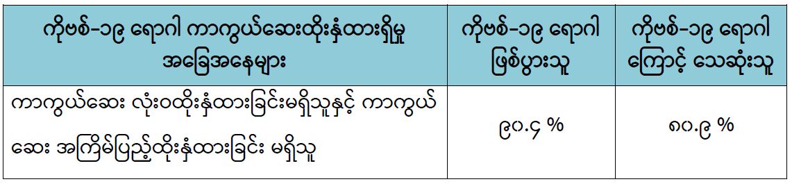 မြန်မာနိုင်ငံတွင် (၂၈-၁-၂၀၂၂) ရက်နေ့မှ (၁၅-၁၀-၂၀၂၂) ရက်နေ့အထိ တွေ့ရှိရသော ကိုဗစ်-၁၉ ရောဂါဖြစ်ပွားသူများနှင့် သေဆုံးသူများ၏ ကိုဗစ်-၁၉ ရောဂါကာကွယ်ဆေး ထိုးနှံထား ရှိမှု အခြေအနေများကို ဆန်းစစ်ချက်အရ ကိုဗစ်-၁၉ ရောဂါဖြစ်ပွားသူ စုစုပေါင်း၏ (၉၀.၄) ရာခိုင် နှုန်းနှင့် ကိုဗစ်-၁၉ ရောဂါကြောင့်သေဆုံးသူ စုစုပေါင်း၏ (၈၀.၉) ရာခိုင်နှုန်းတို့မှာ ကာကွယ်ဆေး လုံးဝ ထိုးနှံထားခြင်းမရှိသူများနှင့် ကာကွယ်ဆေး အကြိမ်ပြည့် ထိုးနှံထားခြင်း မရှိသူများ ဖြစ်ကြောင်း တွေ့ရှိရပါသည်။