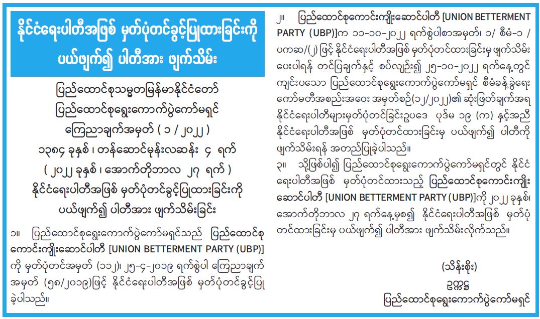 နိုင်ငံရေးပါတီအဖြစ် မှတ်ပုံတင်ခွင့်ပြုထားခြင်းကို ပယ်ဖျက်၍ ပါတီအားဖျက်သိမ်း 10/28/2022 နိုင်ငံရေးပါတီအဖြစ် မှတ်ပုံတင်ခွင့်ပြုထားခြင်းကို ပယ်ဖျက်၍ ပါတီအားဖျက်သိမ်း