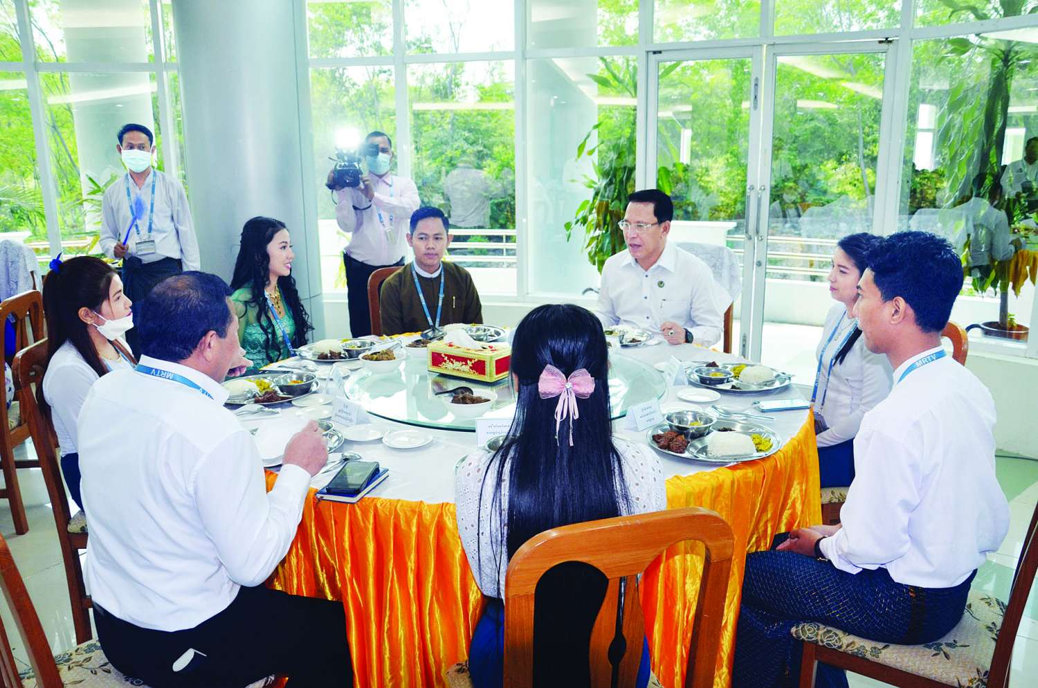 ရှေးဦးစွာ ပြည်ထောင်စု ဝန်ကြီးနှင့်အဖွဲ့သည် မြန်မာ့အသံနှင့်ရုပ်မြင်သံကြားသို့ ရောက်ရှိပြီး စားရိပ်သာတွင် ဝန်ထမ်းများအား ရင်းရင်းနှီးနှီးနှုတ်ဆက်ကာ ဝန်ထမ်းများနှင့်အတူ နေ့လယ်စာ သုံးဆောင်သည်။