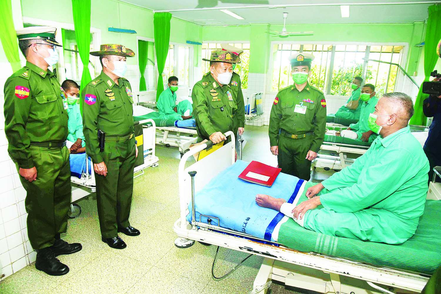 ထို့နောက် ဆေးရုံတက်ရောက်ဆေးကုသမှုခံယူလျက်ရှိသည့် အရာရှိ၊ စစ်သည်၊ မိသားစုများအား လိုက်လံကြည့်ရှု၍ တစ်ဦးချင်း၏ ရောဂါဖြစ်ပွားမှုအခြေအနေများအား မေးမြန်းအားပေးစကားပြောကြားကာ စားသောက်ဖွယ်ရာများနှင့် ထောက်ပံ့ပစ္စည်းများပေးအပ်သည်။