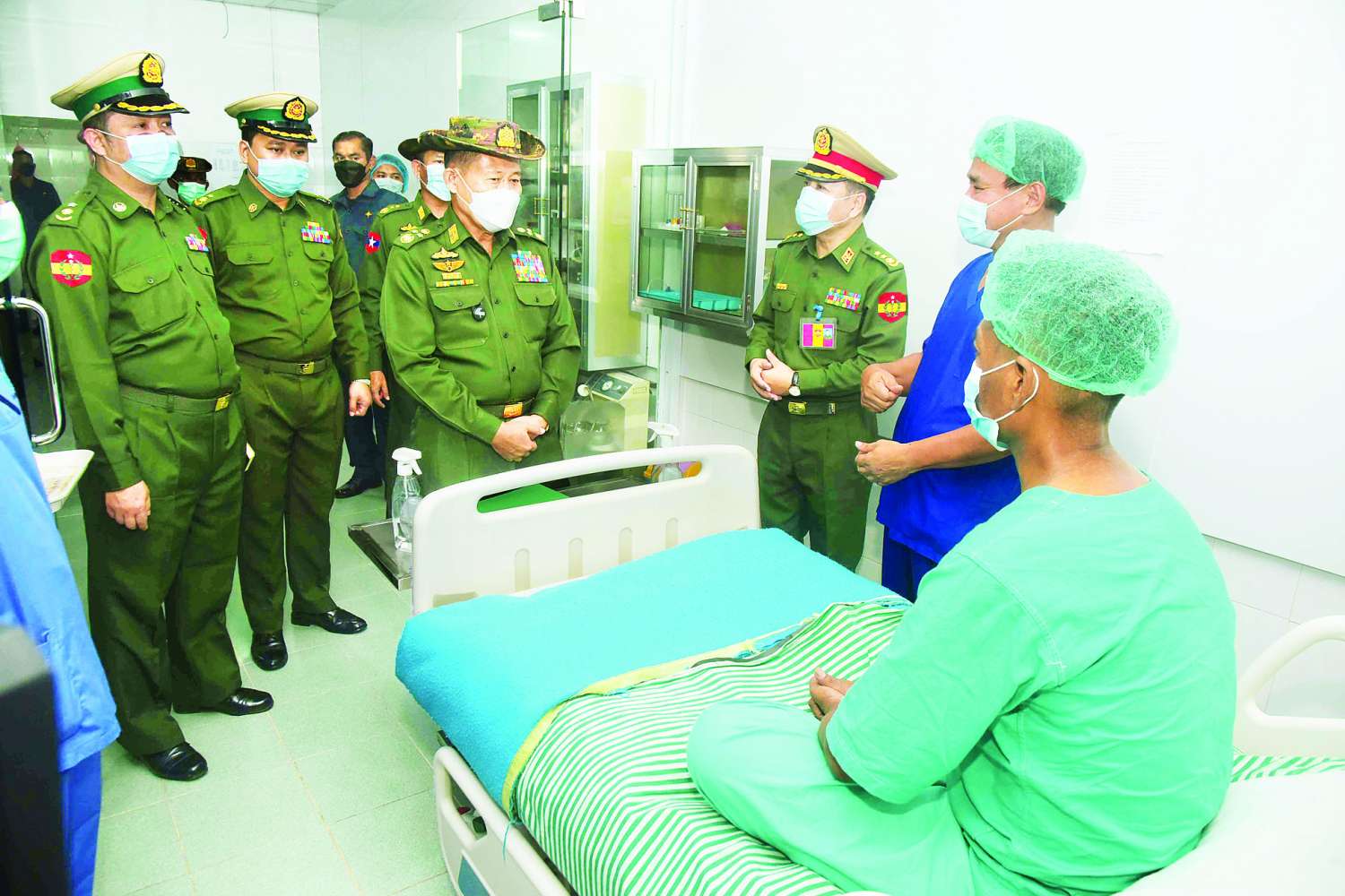 ဦးစွာ နိုင်ငံတော်စီမံအုပ်ချုပ်ရေးကောင်စီဒုတိယဥက္ကဋ္ဌ ဒုတိယတပ်မတော်ကာကွယ်ရေးဦးစီးချုပ် ကာကွယ်ရေးဦးစီးချုပ်(ကြည်း)နှင့် အဖွဲ့ဝင်များသည် တပ်မတော်အရိုးရောဂါအထူးကုဆေးရုံကြီး (ခုတင် ၅၀၀)နှင့် တပ်မတော်ဆေးရုံကြီး (ခုတင် ၁၀၀၀)သို့ ရောက်ရှိကြရာ ဆေးရုံတပ်မှူးနှင့် တာဝန်ရှိသူများက ကြိုဆိုနှုတ်ဆက်ကြသည်။