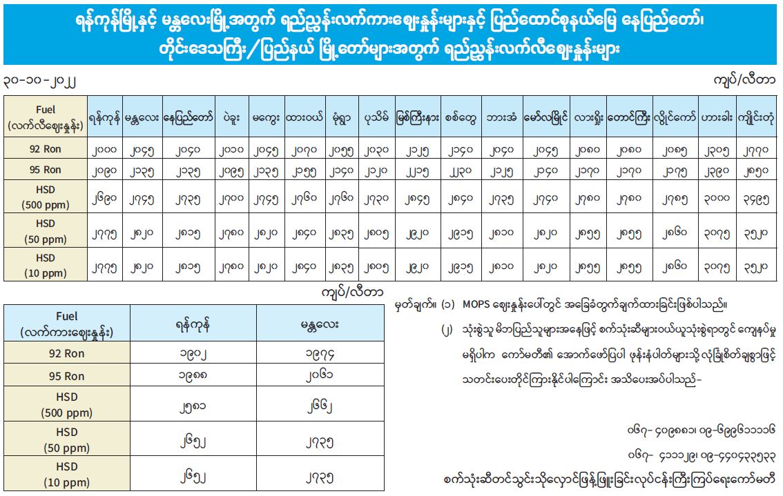 ရန်ကုန်မြို့နှင့် မန္တလေးမြို့အတွက် ရည်ညွှန်းလက်ကားဈေးနှုန်းများနှင့် ပြည်ထောင်စုနယ်မြေ နေပြည်တော်၊ တိုင်းဒေသကြီး/ပြည်နယ် မြို့တော်များအတွက် ရည်ညွှန်းလက်လီဈေးနှုန်းများ 10/30/2022