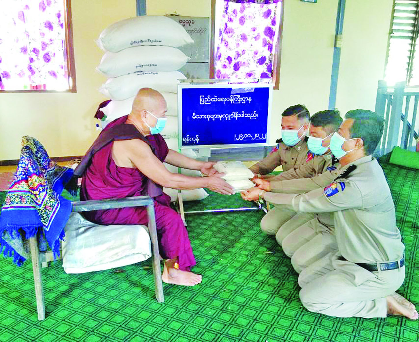 ပြည်ထဲရေးဝန်ကြီးဌာန တပ်ဖွဲ့ဝင်/ဝန်ထမ်း၊ အရာထမ်း၊ အမှုထမ်းမိသားစုများက မြို့နယ်အသီးသီးရှိ ဘုန်းတော်ကြီးကျောင်းများသို့ ဆွမ်းဆန်တော်နှင့် ဆန်ကြာဆံများ ဆက်ကပ် လှူဒါန်းခြင်းကို ဆောင်ရွက်လျက်ရှိသည်။