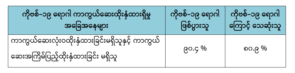 မြန်မာနိုင်ငံတွင် (၂၈-၁-၂၀၂၂) ရက်နေ့မှ (၁၅-၁၀-၂၀၂၂) ရက်နေ့အထိ တွေ့ရှိရသော ကိုဗစ်-၁၉ ရောဂါဖြစ်ပွားသူများနှင့် သေဆုံးသူများ၏ ကိုဗစ်-၁၉ ရောဂါကာကွယ်ဆေး ထိုးနှံထားရှိမှု အခြေအနေများကို ဆန်းစစ်ချက်အရ ကိုဗစ်-၁၉ ရောဂါဖြစ်ပွားသူ စုစုပေါင်း၏ (၉၀.၄) ရာခိုင်နှုန်းနှင့် ကိုဗစ်-၁၉ ရောဂါကြောင့် သေဆုံးသူစုစုပေါင်း၏ (၈၀.၉) ရာခိုင်နှုန်းတို့မှာ ကာကွယ်ဆေး လုံးဝထိုးနှံထားခြင်း မရှိသူများနှင့် ကာကွယ်ဆေးအကြိမ်ပြည့် ထိုးနှံထားခြင်း မရှိသူများဖြစ်ကြောင်း တွေ့ရှိရပါသည်။