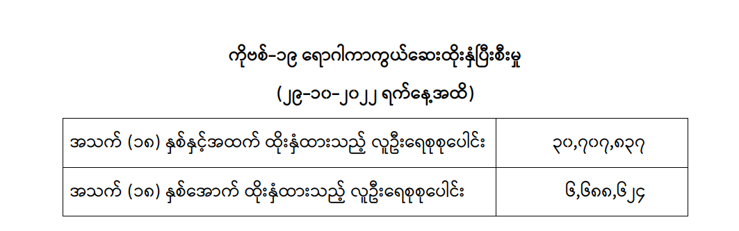COVID-19 ရောဂါ ကာကွယ်ထိန်းချုပ်ရေးအတွက် တိုင်းဒေသကြီး/ ပြည်နယ်များတွင် COVID-19 ရောဂါကာကွယ်ဆေးကို ဦးတည်အုပ်စုများသတ်မှတ်၍ ထိုးနှံပေးလျက်ရှိရာ (၂၉-၁၀-၂၀၂၂) ရက်နေ့အထိ အသက် (၁၈)နှစ်နှင့်အထက် လူဦးရေစုစုပေါင်း (၃၀,၇၀၇,၈၃၇) ဦး နှင့် အသက် (၁၈)နှစ်အောက် လူဦးရေစုစုပေါင်း (၆,၆၈၈,၆၂၄) ဦးတို့အား ထိုးနှံထားရှိပြီး ဖြစ်ပါသည်။
