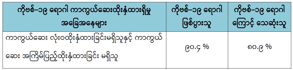 မြန်မာနိုင်ငံတွင် (၂၈-၁-၂၀၂၂) ရက်နေ့မှ (၁၅-၁၀-၂၀၂၂) ရက်နေ့အထိ တွေ့ရှိရသော ကိုဗစ်-၁၉ ရောဂါဖြစ်ပွားသူများနှင့် သေဆုံးသူများ၏ ကိုဗစ်-၁၉ ရောဂါကာကွယ်ဆေး ထိုးနှံထား ရှိမှု အခြေအနေများကို ဆန်းစစ်ချက်အရ ကိုဗစ်-၁၉ ရောဂါဖြစ်ပွားသူ စုစုပေါင်း၏ (၉၀.၄) ရာခိုင် နှုန်းနှင့် ကိုဗစ်-၁၉ ရောဂါကြောင့် သေဆုံးသူ စုစုပေါင်း၏ (၈၀.၉) ရာခိုင်နှုန်းတို့မှာ ကာကွယ်ဆေး လုံးဝထိုးနှံထားခြင်းမရှိသူများနှင့် ကာကွယ်ဆေး အကြိမ်ပြည့် ထိုးနှံထားခြင်းမရှိသူများ ဖြစ်ကြောင်း တွေ့ရှိရပါသည်။