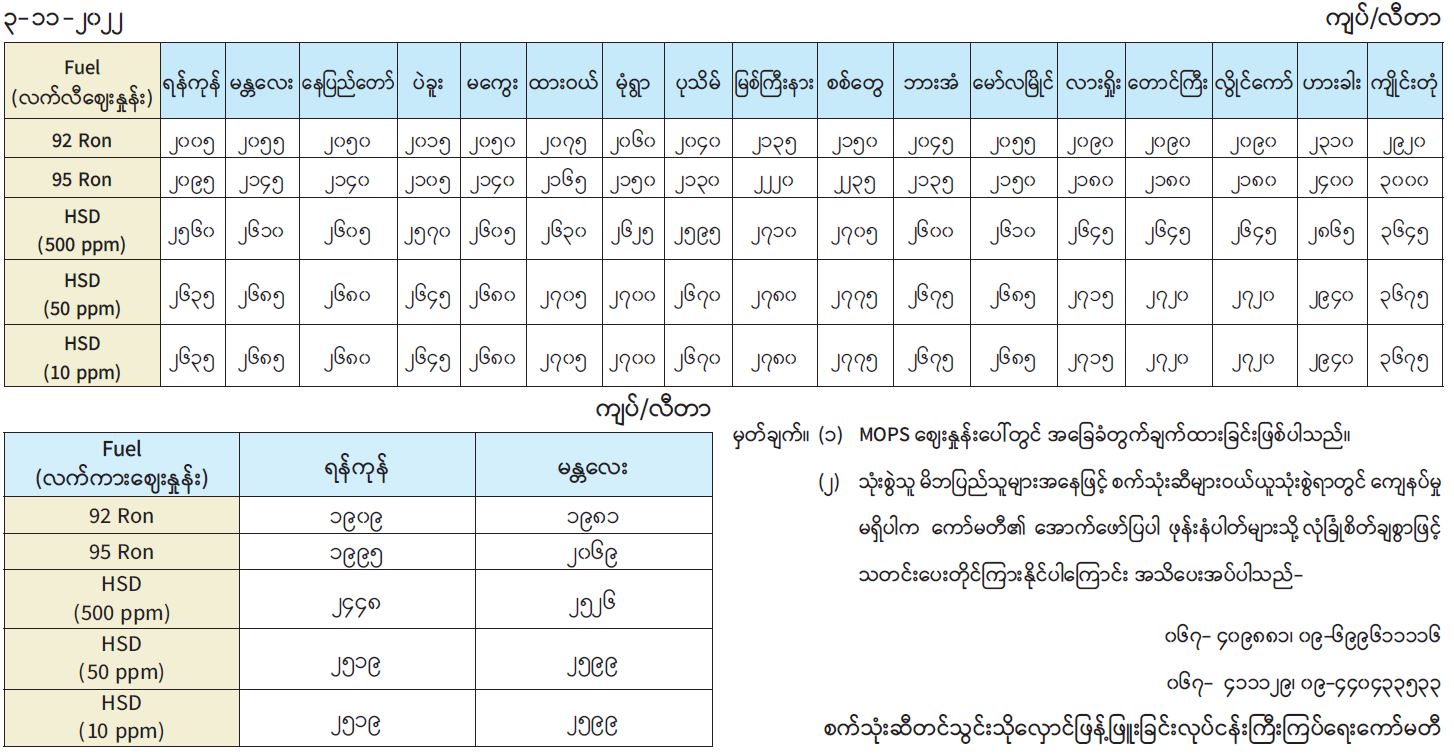ရန်ကုန်မြို့နှင့် မန္တလေးမြို့အတွက် ရည်ညွှန်းလက်ကားဈေးနှုန်းများနှင့် ပြည်ထောင်စုနယ်မြေ နေပြည်တော်၊ တိုင်းဒေသကြီး/ပြည်နယ် မြို့တော်များအတွက် ရည်ညွှန်းလက်လီဈေးနှုန်းများ