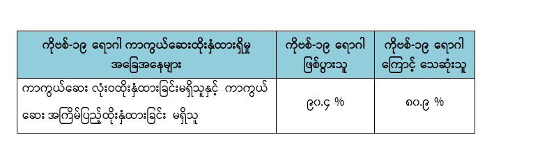 မြန်မာနိုင်ငံတွင် (၂၈-၁-၂၀၂၂) ရက်နေ့မှ (၁၅-၁၀-၂၀၂၂) ရက်နေ့အထိ တွေ့ရှိရသော ကိုဗစ်-၁၉ ရောဂါဖြစ်ပွားသူများနှင့် သေဆုံးသူများ၏ ကိုဗစ်-၁၉ ရောဂါကာကွယ်ဆေး ထိုးနှံထားရှိမှု အခြေအနေများကို ဆန်းစစ်ချက်အရ ကိုဗစ်-၁၉ ရောဂါဖြစ်ပွားသူ စုစုပေါင်း၏ (၉၀.၄) ရာခိုင်နှုန်းနှင့် ကိုဗစ်-၁၉ ရောဂါကြောင့် သေဆုံးသူစုစုပေါင်း၏ (၈၀.၉) ရာခိုင်နှုန်းတို့မှာ ကာကွယ်ဆေး လုံးဝထိုးနှံထားခြင်းမရှိသူများနှင့် ကာကွယ်ဆေးအကြိမ်ပြည့် ထိုးနှံထားခြင်း မရှိသူများဖြစ်ကြောင်း တွေ့ရှိရပါသည်။