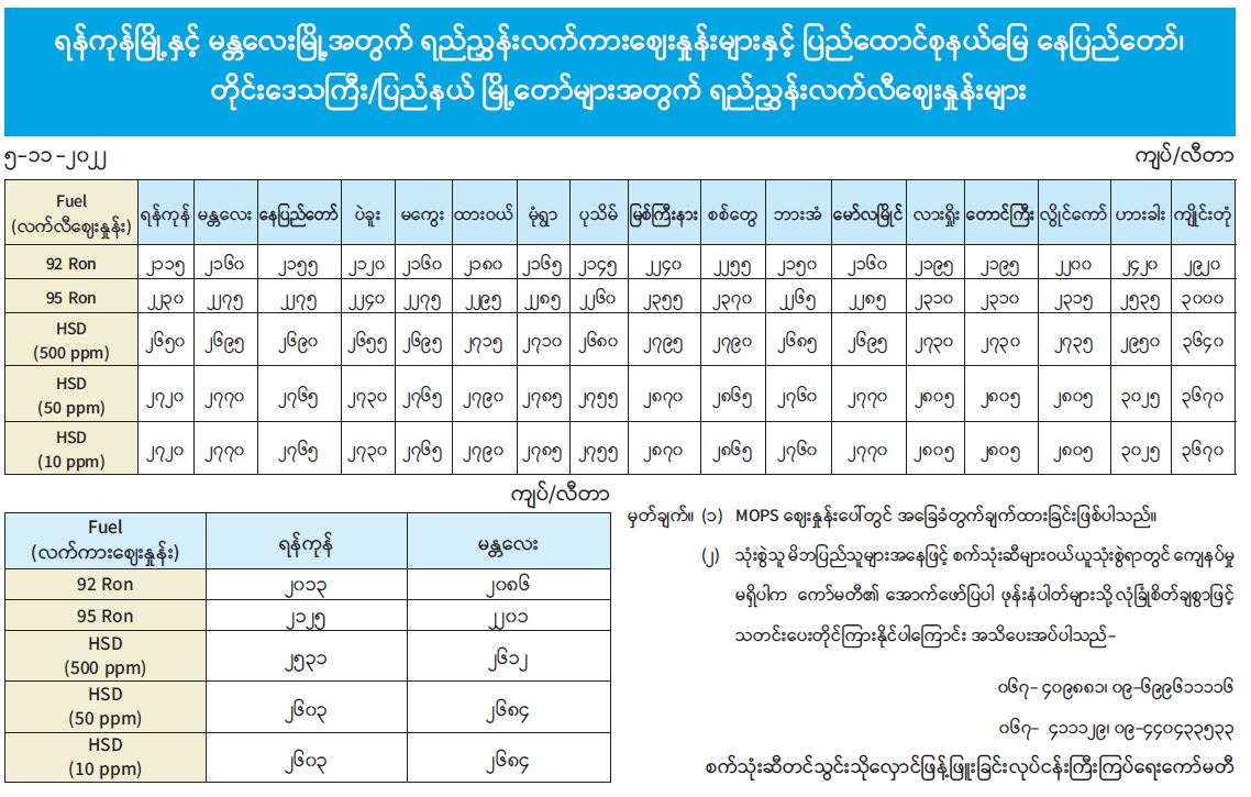 ရန်ကုန်မြို့နှင့် မန္တလေးမြို့အတွက် ရည်ညွှန်းလက်ကားဈေးနှုန်းများနှင့် ပြည်ထောင်စုနယ်မြေ နေပြည်တော်၊ တိုင်းဒေသကြီး/ပြည်နယ် မြို့တော်များအတွက် ရည်ညွှန်းလက်လီဈေးနှုန်းများ 11/05/2022