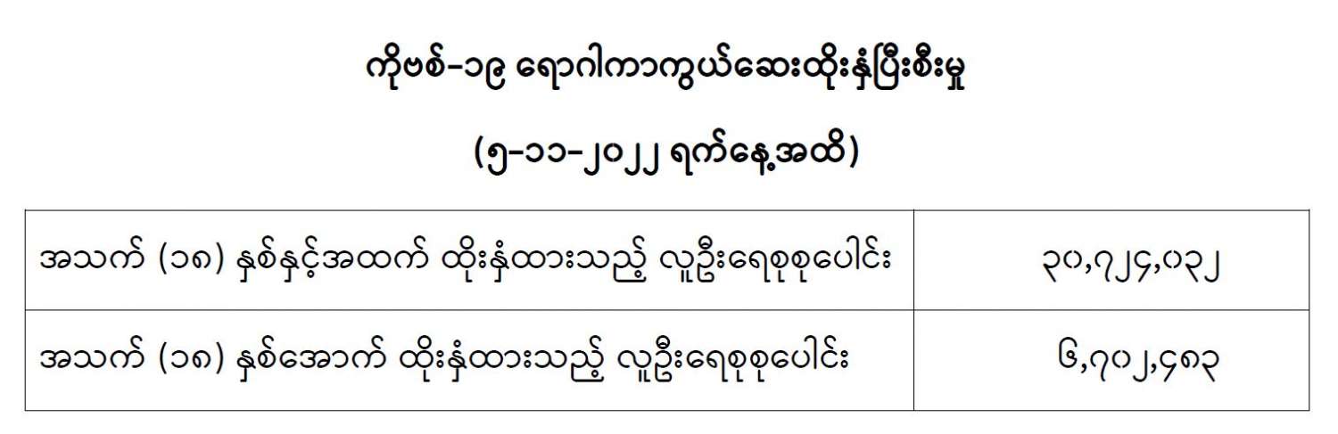 COVID-19 ရောဂါ ကာကွယ်ထိန်းချုပ်ရေးအတွက် တိုင်းဒေသကြီး/ ပြည်နယ်များတွင် COVID-19 ရောဂါကာကွယ်ဆေးကို ဦးတည်အုပ်စုများသတ်မှတ်၍ ထိုးနှံပေးလျက်ရှိရာ (၅-၁၁-၂၀၂၂) ရက်နေ့အထိ အသက် (၁၈) နှစ်နှင့်အထက် လူဦးရေစုစုပေါင်း (၃၀,၇၂၄,၀၃၂) ဦးနှင့် အသက် (၁၈) နှစ်အောက် လူဦးရေစုစုပေါင်း (၆,၇၀၂,၄၈၃) ဦးတို့အား ထိုးနှံထားရှိပြီး ဖြစ်ပါသည်။