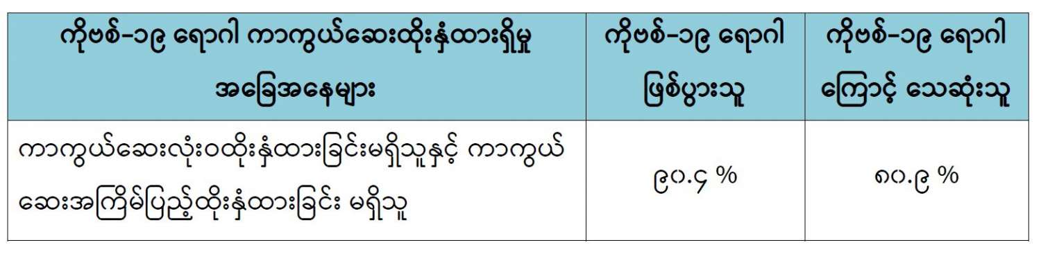 မြန်မာနိုင်ငံတွင် (၂၈-၁-၂၀၂၂) ရက်နေ့မှ (၁၅-၁၀-၂၀၂၂) ရက်နေ့အထိ တွေ့ရှိရသော ကိုဗစ်-၁၉ ရောဂါဖြစ်ပွားသူများနှင့် သေဆုံးသူများ၏ ကိုဗစ်-၁၉ ရောဂါကာကွယ်ဆေး ထိုးနှံထားရှိမှု အခြေအနေများကို ဆန်းစစ်ချက်အရ ကိုဗစ်-၁၉ ရောဂါဖြစ်ပွားသူ စုစုပေါင်း၏ (၉၀.၄) ရာခိုင် နှုန်းနှင့် ကိုဗစ်-၁၉ ရောဂါကြောင့် သေဆုံးသူစုစုပေါင်း၏ (၈၀.၉) ရာခိုင်နှုန်းတို့မှာ ကာကွယ်ဆေး လုံးဝထိုးနှံထားခြင်းမရှိသူများနှင့် ကာကွယ်ဆေးအကြိမ်ပြည့် ထိုးနှံထားခြင်းမရှိသူများဖြစ်ကြောင်း တွေ့ရှိရပါသည်။